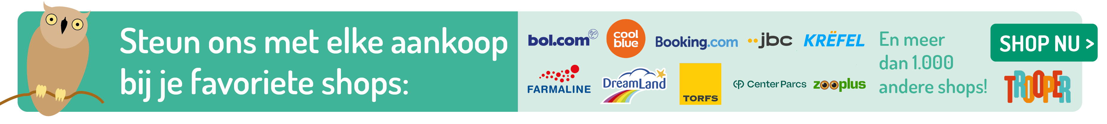 Die aangesloten webshops zijn trouwens niet van de minste: Bol.com, Booking.com, JBC, Krëfel, Torfs,… en nog zo’n 1.000 andere shops! Neem maar eens een kijkje op www.trooper.be/vzwDenBrand.